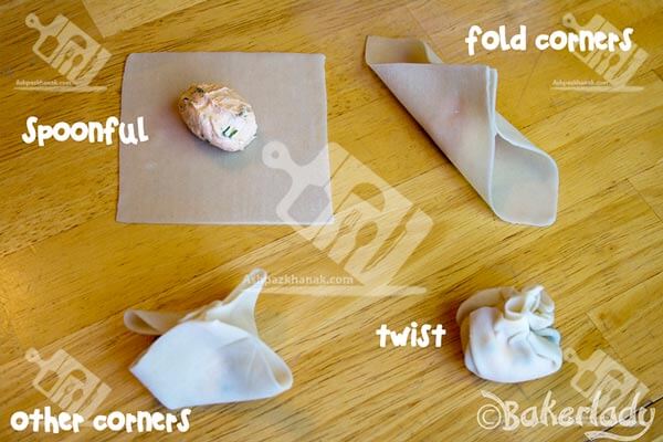 یک قاشق چایخوری از مواد رو وسط خمیر که آن را مربعی بریده اید، بذارید و چهار گوشه خمیر رو جمع کنید و مانند شکل بالا بپیچید. (میتونید هم با یک برگ تره یا برگ نازک پیازچه دورش رو گره بزنید.)
